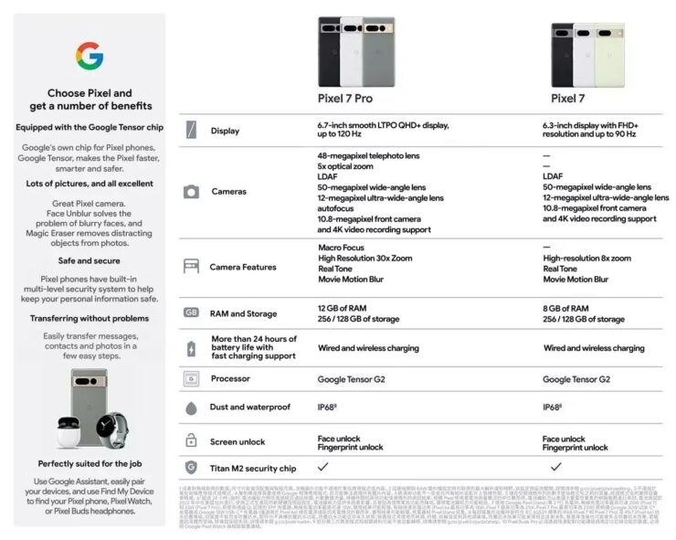Два телефона также поставляются с проводной и беспроводной быстрой зарядкой. Хотя новая утечка на первый взгляд не указывает скорость зарядки, однако если вы посмотрите на мелкий шрифт, то увидите, что Pixel 7 имеет быструю зарядку 21 Вт, а Pixel 7 Pro — 23 Вт, что является довольно низкой скоростью зарядки по сравнению с некоторыми другими альтернативами на рынке.