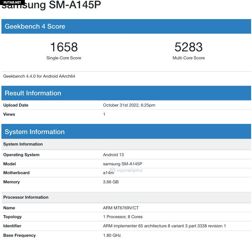 Samsung Galaxy A14 4G замечен в Geekbench — чипсет Helio G88 SoC и Android 13