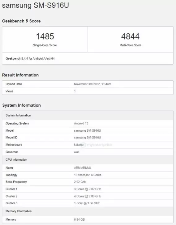 Другие подробности включают 8 гигабайт оперативной памяти на Galaxy S23+. Вы также получите Android 13 из коробки. Результаты показывают, что Snapdragon 8 Gen 2 набирает 1485 баллов в одноядерном режиме и 4844 балла в многоядерном режиме. Стоит отметить, что эти оценки пока далеки от реальных, потому что рассматриваемый Galaxy S23+ более или менее находится на ранних стадиях разработки, а это означает, что фактическая производительность может отличаться.