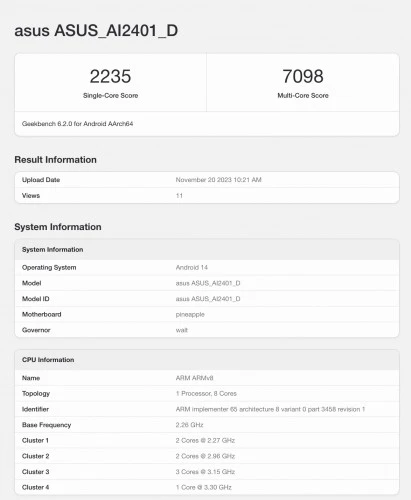 ROG Phone 8 Ultimate (ASUS_AI2401_D) указан на платформе тестирования с чипсетом Snapdragon 8 Gen 3 и колоссальными 24 ГБ оперативной памяти. Устройство набрало впечатляющие 2235 баллов в одноядерном тесте и 7098 баллов в многоядерном тесте. Эти цифры соответствуют данным Qualcomm.