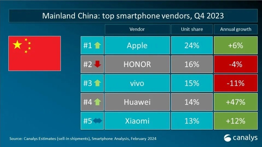 На китайском рынке Apple также заняла первое место с долей рынка 24%, Honor заняла второе место с долей 16%, а Vivo заняло третье место с долей 15%. Четвертое место занимает Huawei, которая продолжает отвоевывать позиции, несмотря на санкционное давление со стороны США.