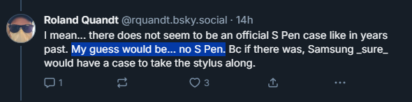 Ещё одним заметным упущением в маркетинговых материалах стало отсутствие упоминания поддержки S Pen. Также нет намёков на чехол со стилусом, что заставило инсайдера Рональда Квандта предположить: «Моя догадка… S Pen не будет».