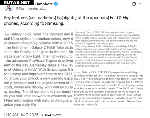 Утечка маркетинговых материалов Galaxy Z Fold7 подтверждает характеристики, но разочаровывает одним моментом