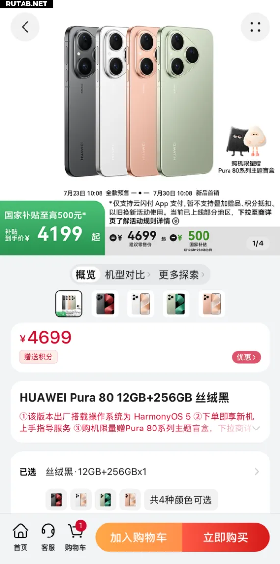 Сегодня стартовали продажи нового флагманского смартфона Huawei Pura 80. Официальная стартовая цена устройства составляет 4699 юаней (~47000 рублей), но с учётом государственных субсидий в некоторых регионах Китая его можно приобрести дешевле — от 4199 юаней (~42000 рублей).