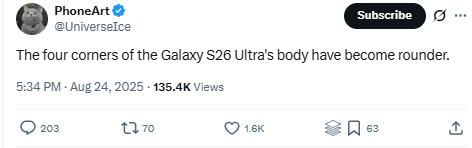 Инсайдер Phoneart (@UniverseIce) сообщил 24 августа, что Galaxy S26 Ultra будет иметь гораздо более скруглённые углы по сравнению с предшественниками. Серия Ultra впервые приняла квадратный стиль с Galaxy S22 Ultra, который также принёс встроенный слот для S Pen. Этот дизайн сохранился в S23 и S24 Ultra, в то время как текущий S25 Ultra лишь незначительно смягчил грани.