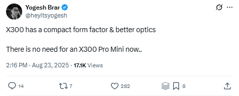 Инсайдер Йогеш Брар утверждает, что vivo X300 будет компактным флагманом, несмотря на установку улучшенного фотооборудования. Хотя он не поделился размером экрана, его заявление «Теперь нет необходимости в X300 Pro Mini…» намекает, что телефон может быть достаточно небольшим, чтобы войти в число лучших компактных флагманов 2025 и 2026 годов.