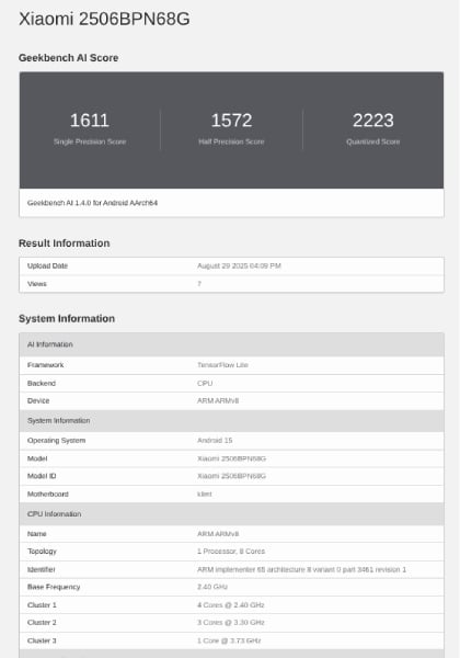 По результатам тестов устройство набрало 1611 баллов в тесте с одинарной точностью, 1572 балла с половинной точностью и 2223 балла в квантованных тестах. Запись в Geekbench также показывает, что телефон работает на Android 15 и оснащен 12 ГБ оперативной памяти.