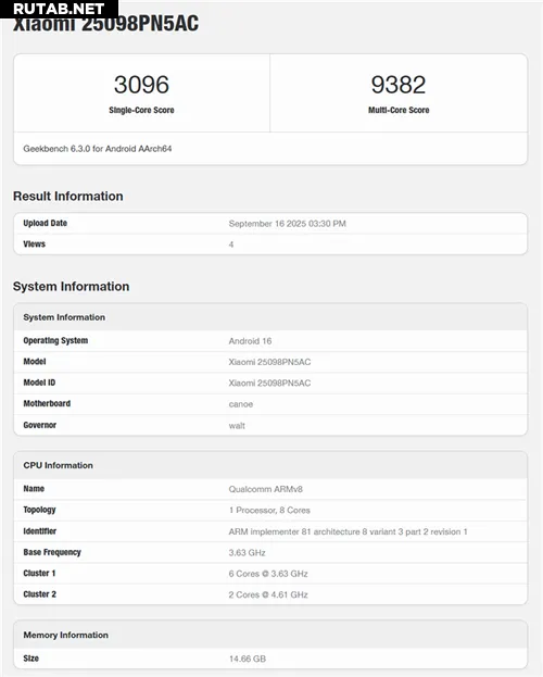 В базе данных бенчмарка Geekbench обнаружена модель Xiaomi с номером 25098PN5AC. По данным инсайдеров, это предстоящий флагман Xiaomi 17 Pro.