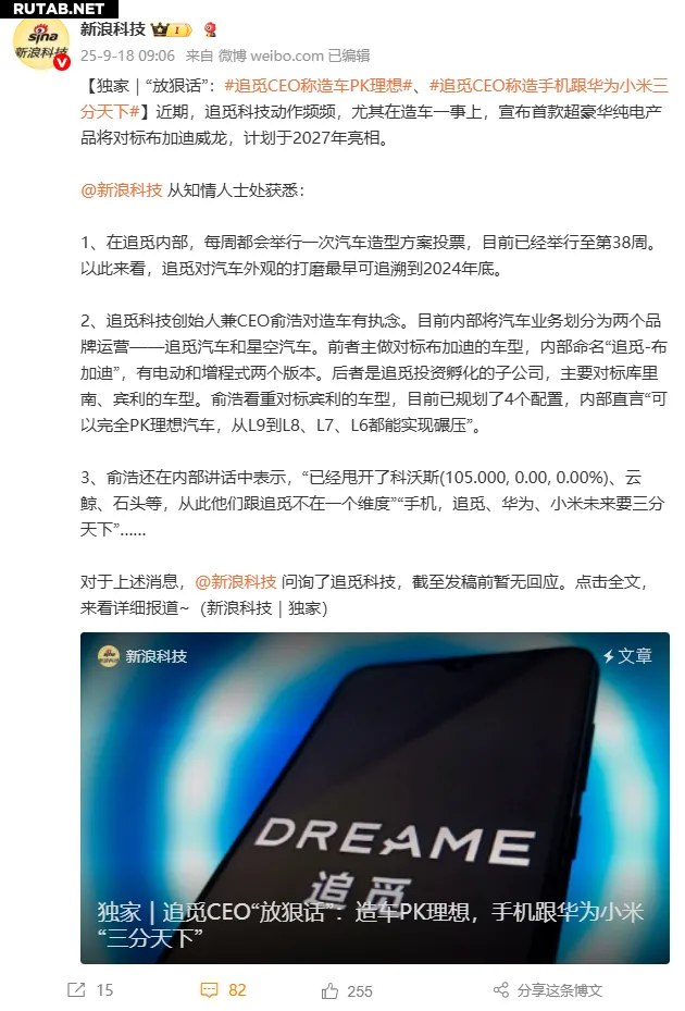 Помимо смартфонов, Dreame также намерена присоединиться к «армии» производителей электромобилей. Юй Хао сообщил, что компания будет создавать модели, сопоставимые с Bentley, с колёсной базой 3.2 и 3.3 метра. «Одно шасси будет реализовывать четыре конфигурации, в этом мы будем учиться у Xiaomi, и суффиксы в названиях тоже возьмём за образец», — заявил он, добавив, что их продукция сможет «полностью превзойти автомобили Li Auto, от L9 до L6».