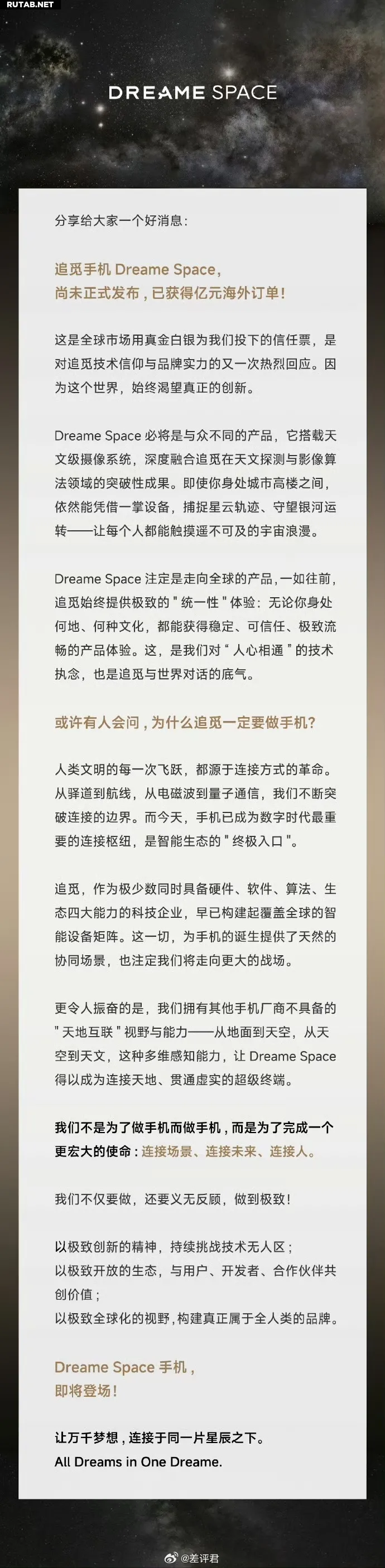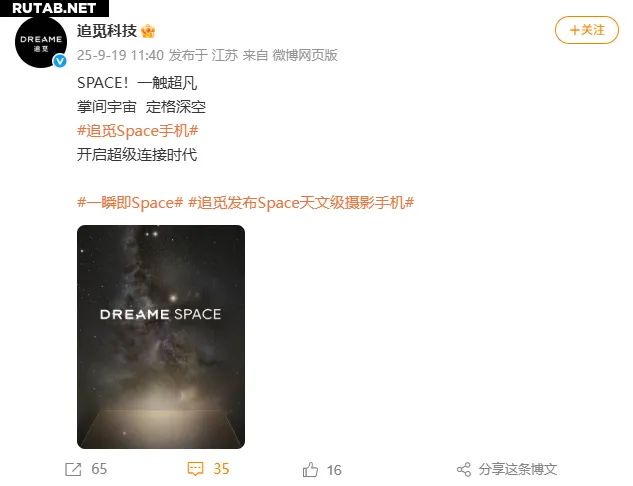 Пока официальные спецификации устройства не раскрываются, но в предварительных публикациях в Weibo создана тема «Dreame представляет смартфон для астрономической съёмки Space», что указывает на особый акцент в области возможностей камеры.