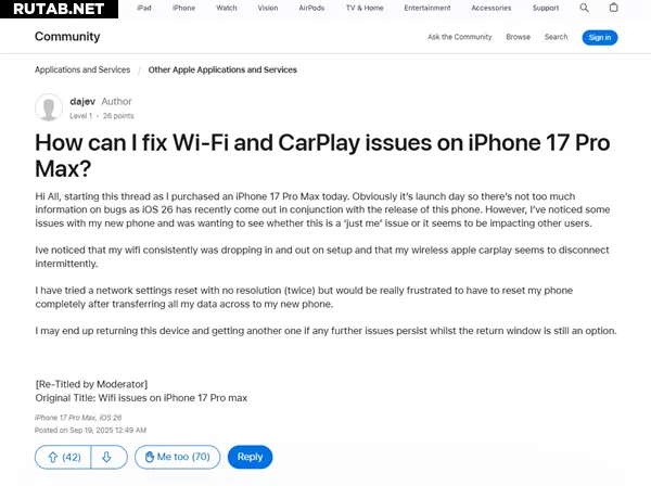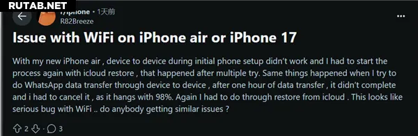 Согласно сообщениям на форумах MacRumors, Reddit и в сообществе поддержки Apple, пользователи новых iPhone 17 серии и модели iPhone Air столкнулись с проблемой периодического отключения Wi-Fi.