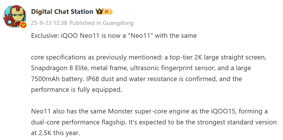 По информации инсайдера, Neo 11, как ожидается, получит большой плоский 2K-дисплей, чипсет Snapdragon 8 Elite, прочный металлический каркас и ультразвуковой сканер отпечатков пальцев. Важной частью комплектации станет огромный аккумулятор емкостью 7500 мАч, а защита от пыли и воды по стандарту IP68 повысит долговечность. Сертификация 3C уже показала, что смартфон будет поддерживать 100-ваттную зарядку.