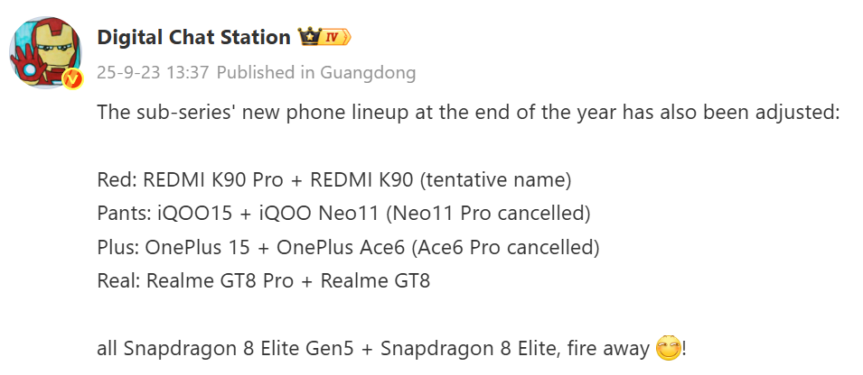 OnePlus, как ожидается, представит OnePlus 15 на Snapdragon 8 Elite Gen 5 и OnePlus Ace 6 на Snapdragon 8 Elite, при этом ранее планировавшаяся версия OnePlus Ace 6 Pro, по сообщениям, отменена. Realme, в свою очередь, готовит GT 8 Pro на Snapdragon 8 Elite Gen 5 и GT 8 на Snapdragon 8 Elite.