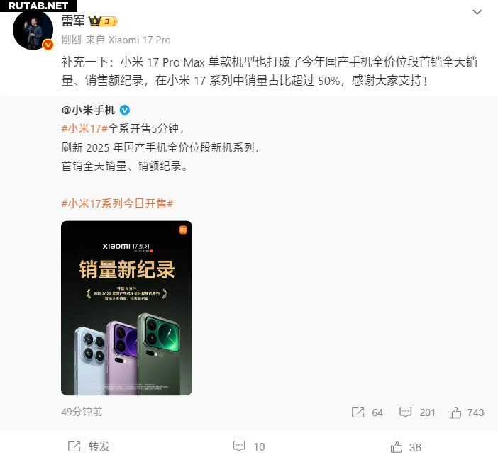 Основатель компании Лэй Цзюнь (Lei Jun) лично сообщил, что самая дорогая модель — Xiaomi 17 Pro Max — побила рекорды по количеству проданных единиц и выручке за первый день продаж среди всех флагманских смартфонов местных брендов в этом году. Более того, на её долю пришлось более 50% продаж всей серии Xiaomi 17 в день старта.