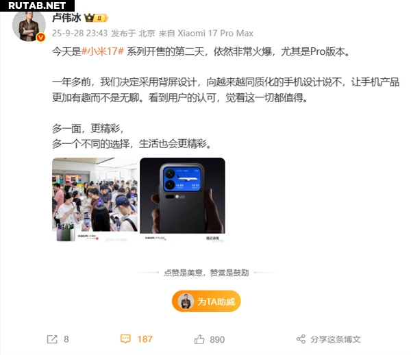 Поздно вечером 28 сентября президент Xiaomi Group Лу Вэйбинь сообщил, что на второй день после начала продаж серия Xiaomi 17 по-прежнему пользуется очень высоким спросом, особенно версия Pro.