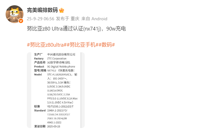 Смартфон Nubia Z80 Ultra прошёл сертификацию и поддерживает быструю зарядку мощностью 90 Вт. Ранее компания официально анонсировала, что презентация новинки состоится в октябре.