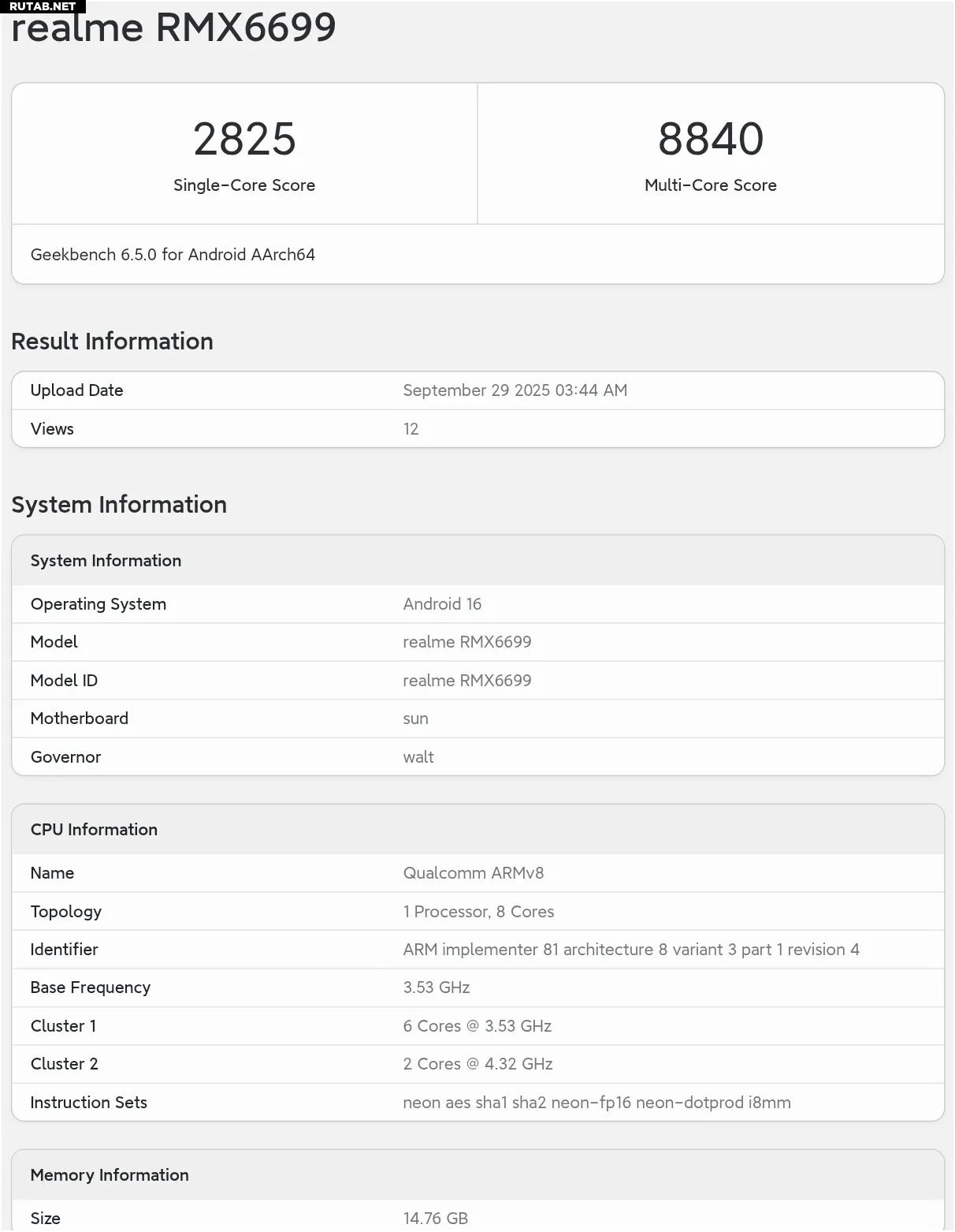 Realme GT8 с Snapdragon 8 Elite Edition и 16 ГБ памяти показал результаты тестов