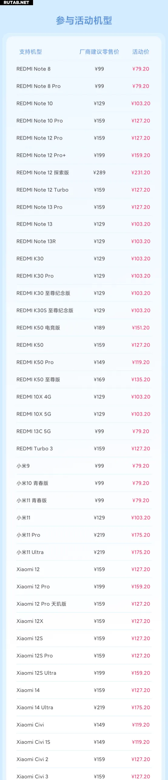 Акция распространяется на 42 модели смартфонов, минимальная цена замены составляет 79,2 юаня. Ниже приведен полный список поддерживаемых устройств: