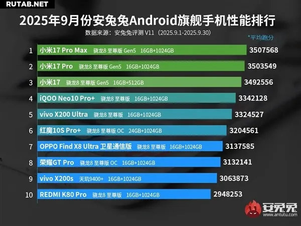 Сервис AnTuTu опубликовал рейтинг производительности флагманских Android-смартфонов за сентябрь, в котором использовались результаты тестов версии бенчмарка V11.