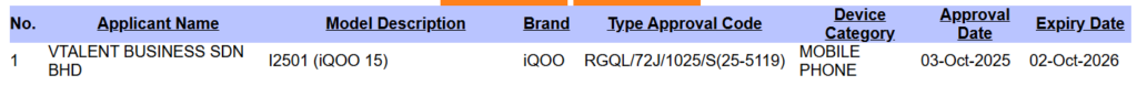 Хотя iQOO Malaysia официально не анонсировала выход iQOO 15, устройство уже появилось в базе данных малайзийского органа по сертификации SIRIM. Смартфон фигурирует под моделью I2501.