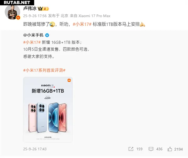 Лю Вэйбинг, вице-президент Xiaomi, пояснил причину появления этой версии: «Вчера вечером меня сильно раскритиковали, но я прислушался к совету, и версия стандартной модели Xiaomi 17 с 1 ТБ памяти была организована немедленно».