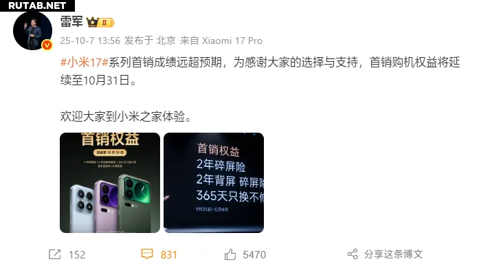 Основатель и генеральный директор Xiaomi Лэй Цзюнь заявил, что первые продажи серии смартфонов Xiaomi 17 значительно превзошли ожидания компании. В знак благодарности за поддержку право первоочередной покупки будет продлено до 31 октября.