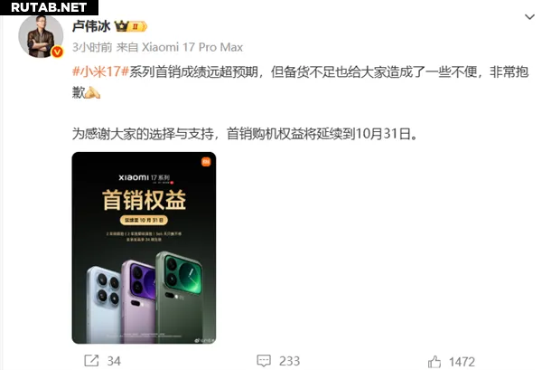 Партнёр и президент Xiaomi Group Лу Вейбинг опубликовал на Weibo официальное заявление: «Первые продажи серии Xiaomi 17 значительно превзошли ожидания, но недостаточный запас доставил всем некоторые неудобства. Мне очень жаль».