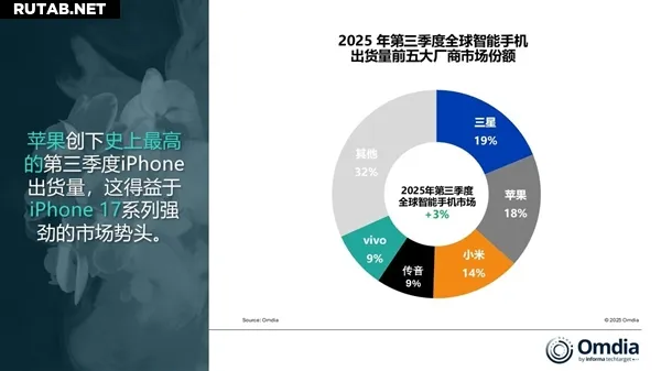 Поставки iPhone от Apple выросли на 4%, установив рекордный для компании показатель в третьем квартале. Рост обеспечен ажиотажным спросом на новую серию iPhone 17, доля рынка Apple достигла 18%.
