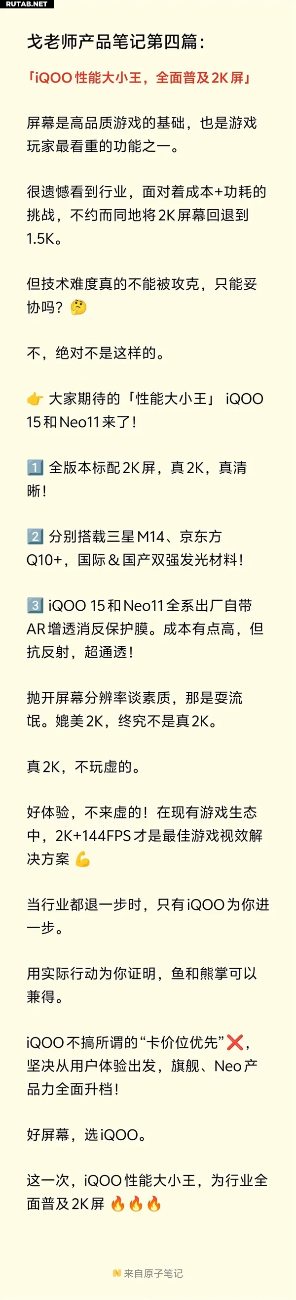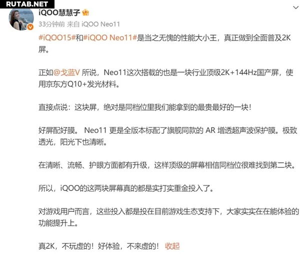 «Когда вся отрасль делает шаг назад, только iQOO делает шаг вперёд для вас, доказывая на деле, что можно получить и рыбу, и удочку. iQOO не придерживается так называемого "приоритета ценового сегмента", а твёрдо исходит из пользовательского опыта. На этот раз iQOO полностью внедряет 2K-экраны в индустрии».