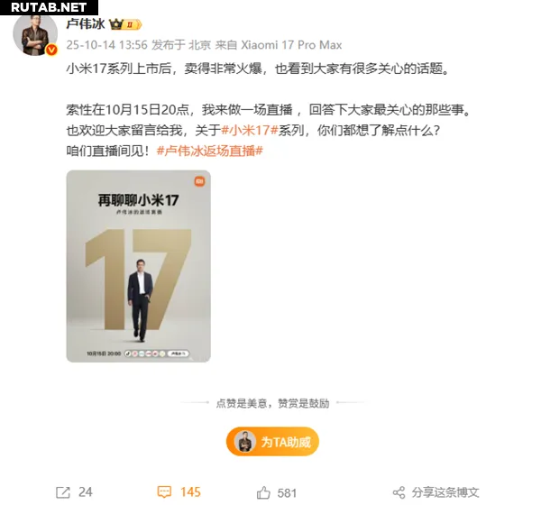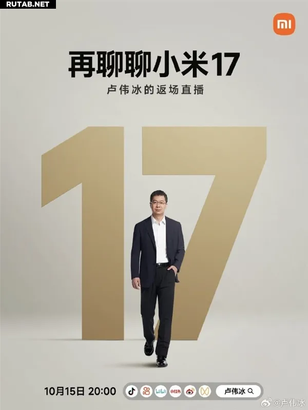 Лу Вэйбин объявил, что проведёт ответную прямую трансляцию 15 октября в 20:00 по пекинскому времени (15:00 мск), чтобы ответить на волнующие всех вопросы о серии Xiaomi 17.