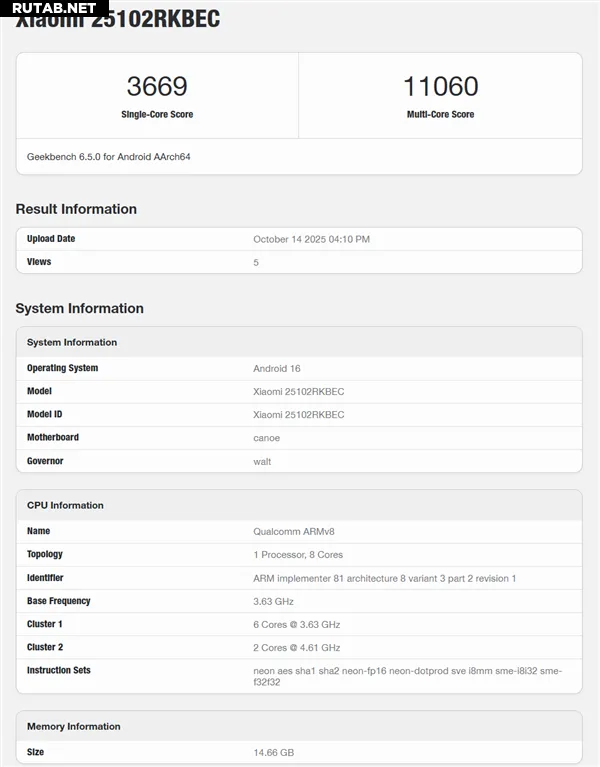 Ранее результаты тестов Redmi K90 уже появлялись в сети, а теперь в базе данных GeekBench обнаружены результаты и для Redmi K90 Pro. Смартфон использует процессор Snapdragon 8 Elite Gen 5 и 16 ГБ оперативной памяти, демонстрируя максимальные результаты в 3669 баллов в однопоточном тесте и 11060 баллов в многопоточном.