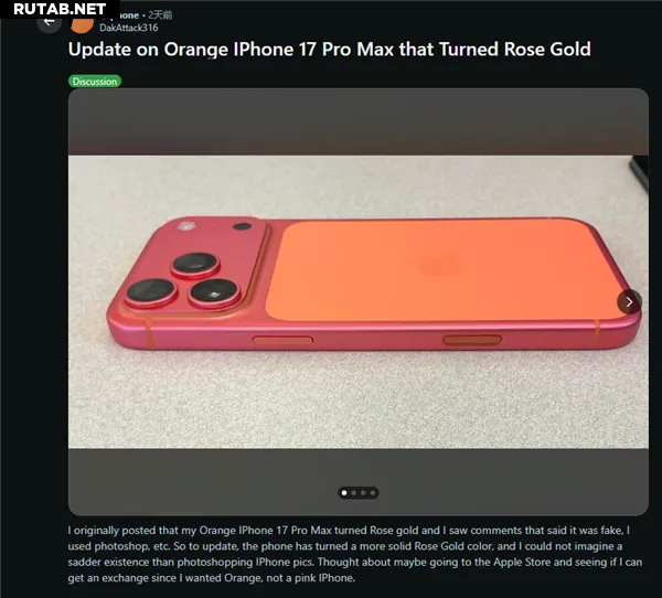 Пользователь на Reddit сообщил, что задняя панель его iPhone 17 Pro Max в цвете «Звёздный апельсин» выцвела и приобрела «розовое золото» — алюминиевая поверхность почти полностью потеряла оранжевый оттенок.