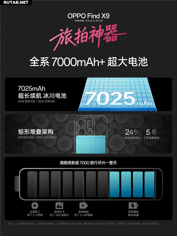 Кроме того, вся серия Find X9 оснащена аккумуляторами ёмкостью более 7000 мАч, которые получили название «Ледниковая батарея». Производитель заявляет о лидирующих показателях автономности, что позволяет отказаться от портативного аккумулятора во время длительных съёмок. Также смартфоны получили отдельный чип усиления связи «Шаньхай» (山海通信), который обеспечивает стабильный сигнал.