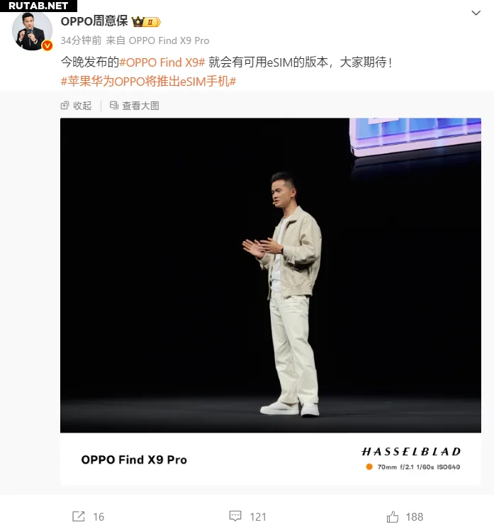 Глава продуктовой линейки OPPO Find Чжоу Ибао сообщил, что версия OPPO Find X9 с поддержкой eSIM будет представлена уже сегодня вечером.