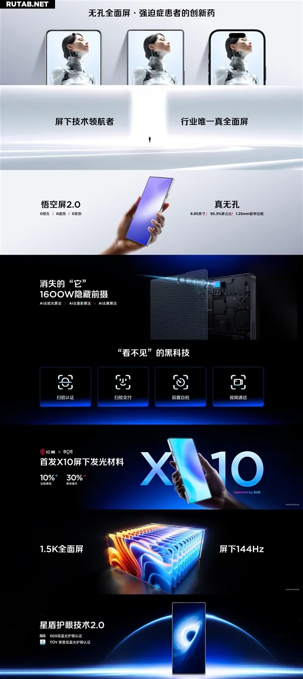 Диагональ дисплея составляет 6,85 дюйма, соотношение экрана к корпусу — 95,3%. Производитель подчеркивает полное отсутствие вырезов и компромиссов. Устройство первым получает подэкранный светоизлучающий материал X10, который снижает энергопотребление на 10% и увеличивает срок службы на 30%. Разрешение экрана — 1,5K, частота обновления — 144 Гц. Применена технология защиты зрения Star Shield 2.0, имеется сертификат SGS Low Blue Light.
