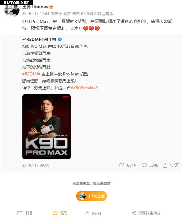 После анонса бывший генеральный менеджер бренда Redmi Ван Тэн впервые за более чем месяц обновил свой микроблог, чтобы поддержать новинку. Он написал: «K90 Pro Max — самая мощная серия K в истории. Команда разработчиков и производства вложила много усилий в его создание», а также пожелал успешного запуска и больших продаж.