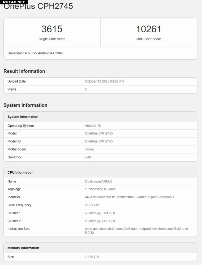 Список Geekbench показывает, что OnePlus 15 на базе Snapdragon 8 Elite Gen 5 набрал 3615 и 10261 баллов в однопоточном и многопоточном тестах соответственно. Название чипа в списке не указано, но данные о CPU и GPU (через исходный код) достаточны, чтобы подтвердить, что он оснащен самым мощным чипсетом Snapdragon.