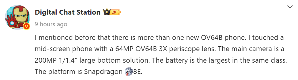 В то время как детали о сверхширокоугольной камере остаются нераскрытыми, утечка подтверждает наличие перископного телеобъектива OmniVision OV64B на 64 мегапикселя с 3-кратным оптическим зумом.
