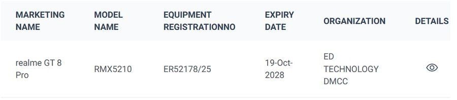Как показано в недавнем списке, Realme GT 8 Pro с номером модели RMX5210 был одобрен регулирующим органом ОАЭ TDRA. Эта сертификация позволяет предположить, что глобальный запуск устройства не за горами, хотя в списке нет никаких конкретных деталей о его аппаратном обеспечении или функциях.