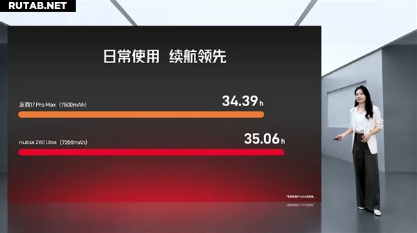 По результатам тестов, Nubia Z80 Ultra демонстрирует время работы при обычном использовании до 35,06 часов, что превосходит показатели конкурентов с аккумуляторами 7500 мАч, которые работают до 34,39 часов.