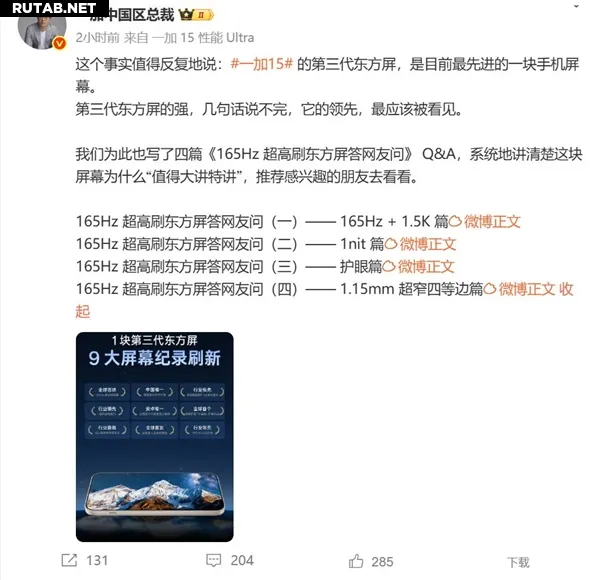 Президент OnePlus в Китае Ли Цзе заявил, что дисплей третьего поколения Oriental Screen в смартфоне OnePlus 15 является «самым передовым экраном для смартфона на текущий момент». По его словам, «преимущества нового экрана невозможно описать несколькими фразами, его лидерство должно быть замечено».