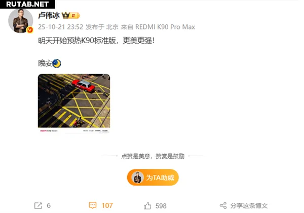 Поздно вечером 21 октября президент Xiaomi Group Лу Вэйбин объявил, что стандартная версия REDMI K90 начнет предварительный анонс сегодня, став «более красивой и мощной».
