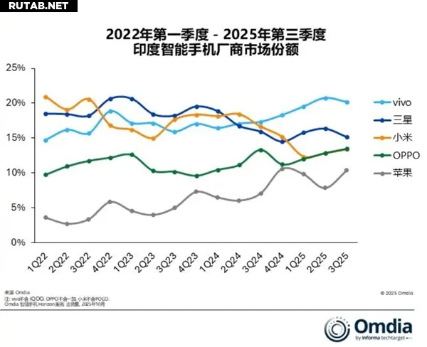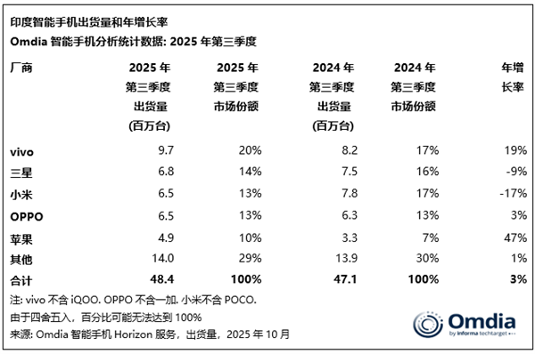 Согласно последним данным консалтинговой компании Omdia, рынок смартфонов в Индии в третьем квартале 2025 года вырос на 3% в годовом исчислении, а объем поставок достиг 48,4 млн устройств.