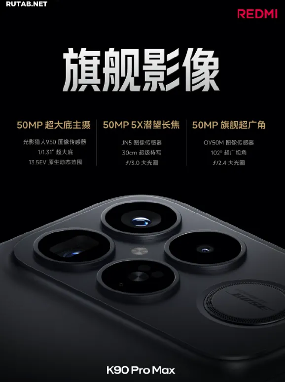 Согласно представленной информации, Redmi K90 Pro Max оснащен самой большой основной камерой в истории Redmi с сенсором «Light Hunter 950» (光影猎人950) размером 1/1.31 дюйма.