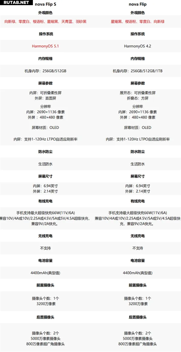 Согласно сравнению характеристик, предоставленному службой поддержки Huawei, nova Flip S получил два новых цвета: небесно-голубой и песочно-чёрный, и поставляется с предустановленной операционной системой HarmonyOS 5.1. Остальные характеристики в целом аналогичны предыдущей модели nova Flip.