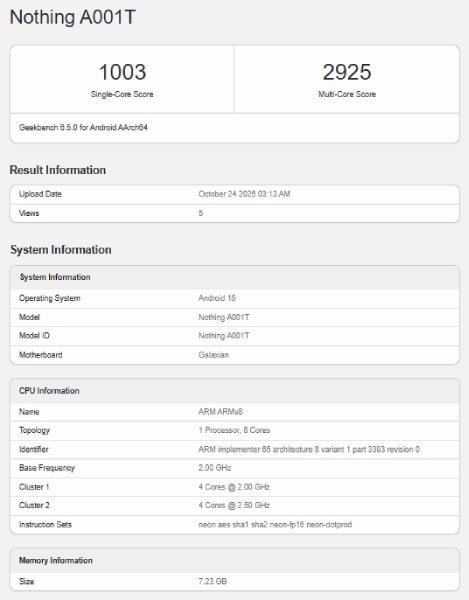Устройство имеет модельный номер Nothing A001T и работает на чипсете MediaTek Dimensity 7300 в паре с 8 ГБ оперативной памяти. Также оно поставляется с предустановленной операционной системой Android 15.
