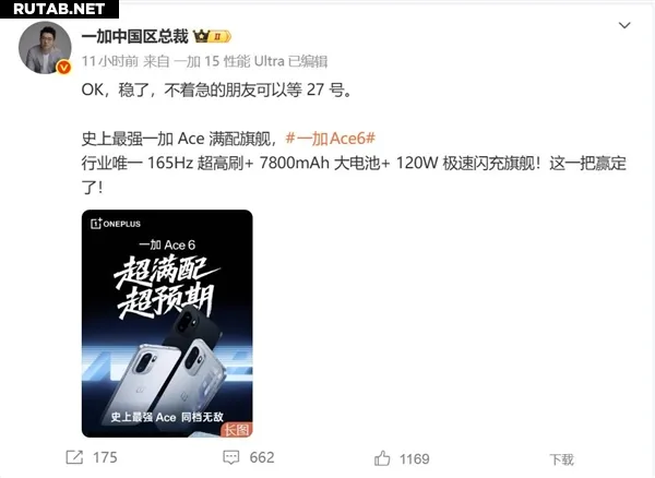 Президент OnePlus в Китае Ли Цзе заявил, что не торопящиеся с покупкой пользователи могут дождаться 27 октября выхода «самого мощного в истории OnePlus Ace» — флагмана с максимальной комплектацией, единственного на рынке с дисплеем 165 Гц, аккумулятором 7800 мАч и поддержкой сверхбыстрой зарядки 120 Вт. По его словам, «на этот раз победа обеспечена».