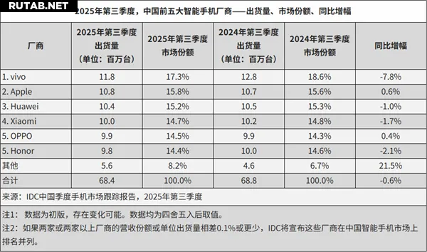 Согласно данным IDC, поставки смартфонов в Китае в третьем квартале 2025 года составили около 68,4 млн единиц, что на 0,6% меньше, чем годом ранее. При этом поставки OPPO составили 9,9 млн единиц, что составляет 14,5%, увеличившись на 0,4% в годовом исчислении.