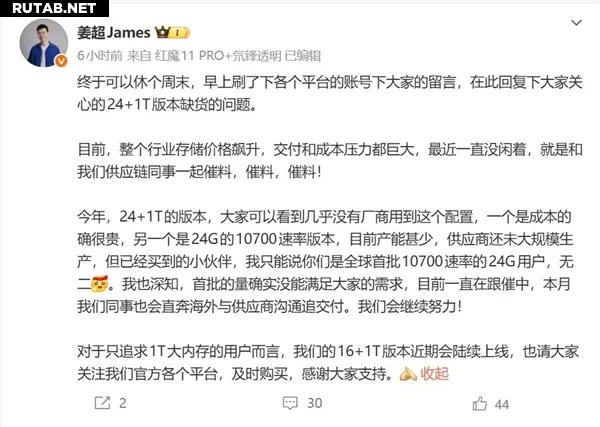 Генеральный менеджер по продукту игрового смартфона Red Magic Цзян Чао заявил, что в настоящее время вся отрасль столкнулась со стремительным ростом цен на модули памяти, что создает серьезное давление как на поставки, так и на себестоимость.
