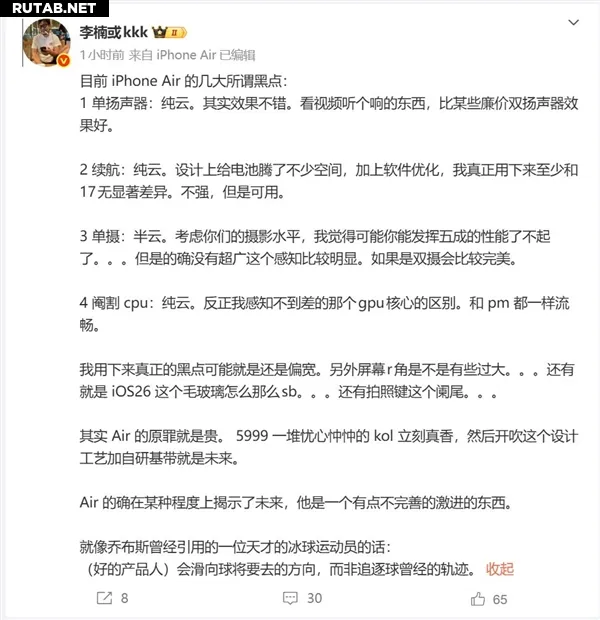 Ли Нань отметил: «На самом деле главный недостаток iPhone Air — это высокая цена. Если бы он стоил 5999 юаней, многие обеспокоенные инфлюенсеры сразу же начали бы восхищаться им и расхваливать дизайн, технологию изготовления и собственный модем как будущее смартфонов». По его мнению, iPhone Air действительно в некоторой степени демонстрирует будущее, представляя собой довольно радикальный, но несовершенный продукт.